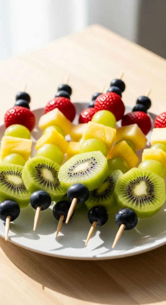 Cut fruit into bite-size pieces. Slide different colors onto short skewers. Keep patterns simple so kids can recognize each fruit.