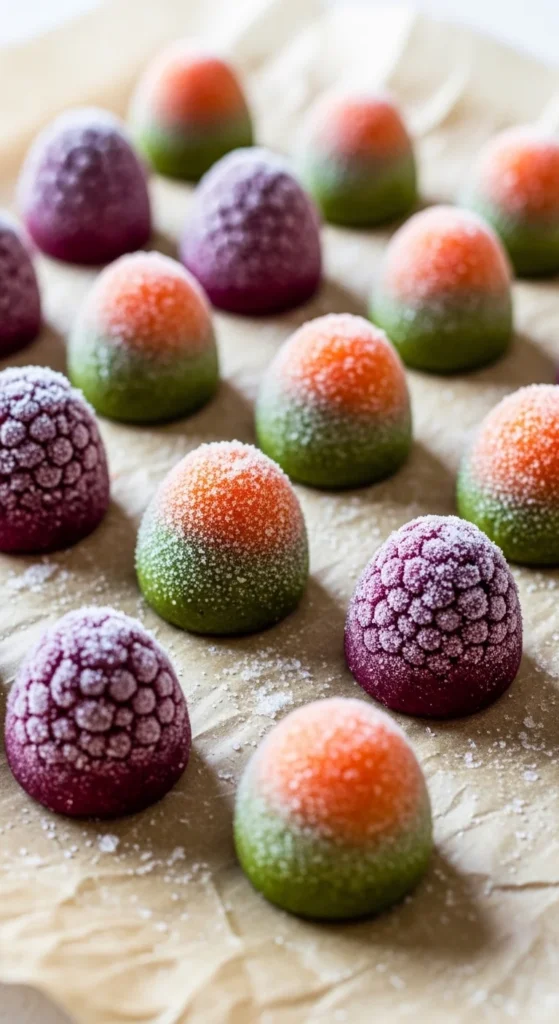 Blend yogurt and fruit. Spoon small dots onto parchment. Freeze until firm.
