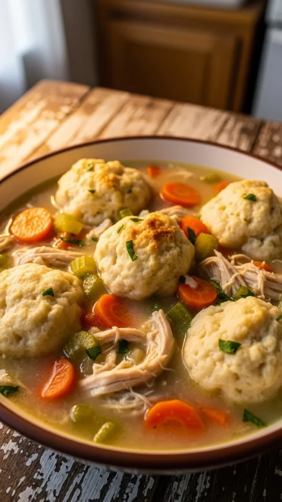 Image Prompt: A warm ceramic bowl filled with creamy chicken and wild rice soup, soft steam rising, chunks of chicken, vegetables, and herbs visible, photographed in natural golden light on a rustic table.