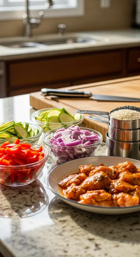 - Prep ingredients in advance: Chop vegetables, marinate meat, or pre-cook grains to save time during the evening rush.