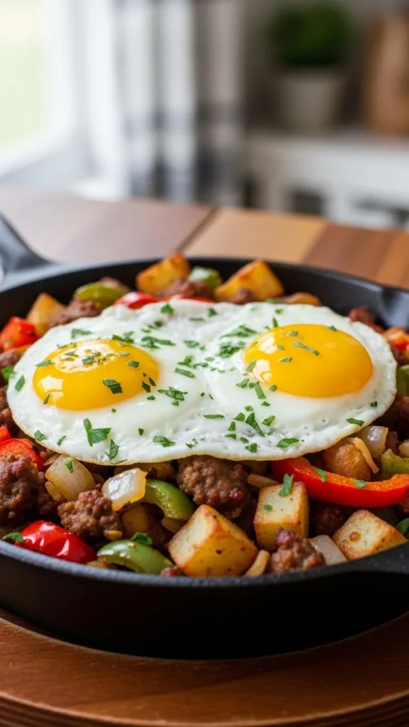 - Breakfast skillets with eggs, potatoes, and vegetables