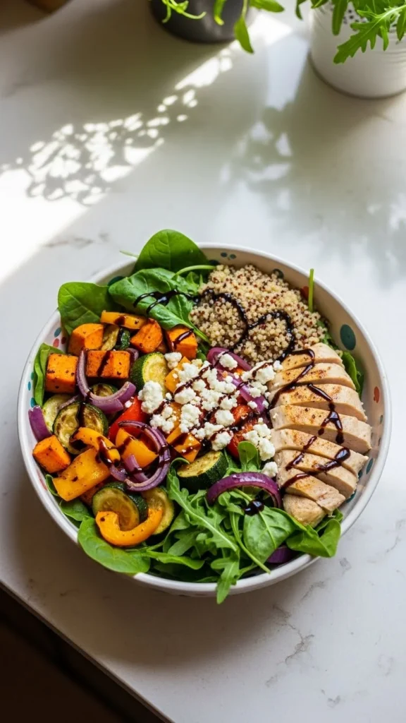 Grilled chicken + roasted veggies + a small serving of quinoa + lemon garlic dressing.