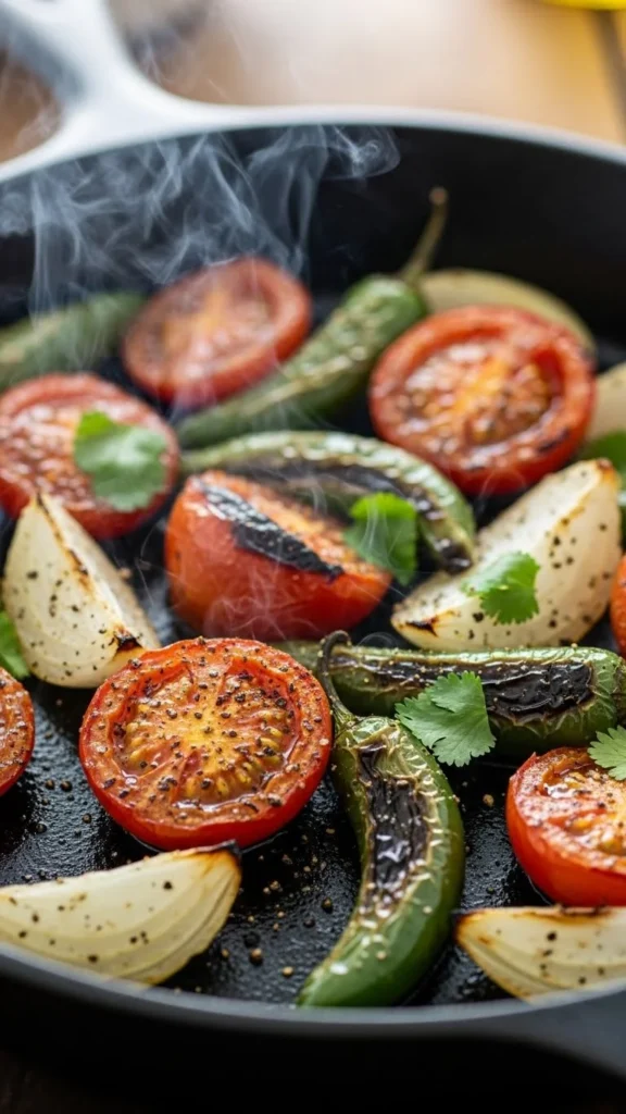 - Roast tomatoes, onions, and chilies until slightly charred