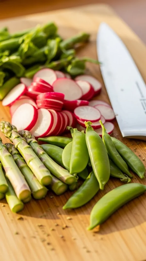 Wash and chop the asparagus, snap peas, and radishes. Keeping the pieces small helps every bite feel balanced.