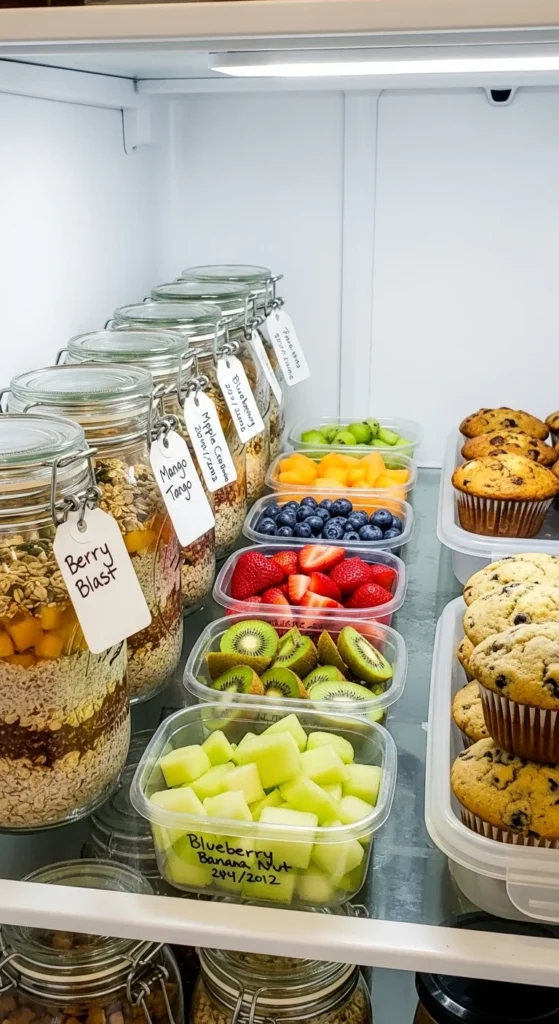 Breakfast Muffins: Bake egg, veggie, or banana muffins ahead of time. Keep a batch in the fridge for quick access.