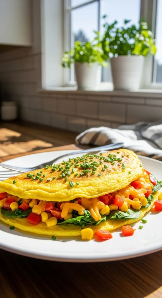 Veggie Omelette: Sauté diced peppers, onions, and spinach. Add beaten eggs and cook until set. Fold and serve.