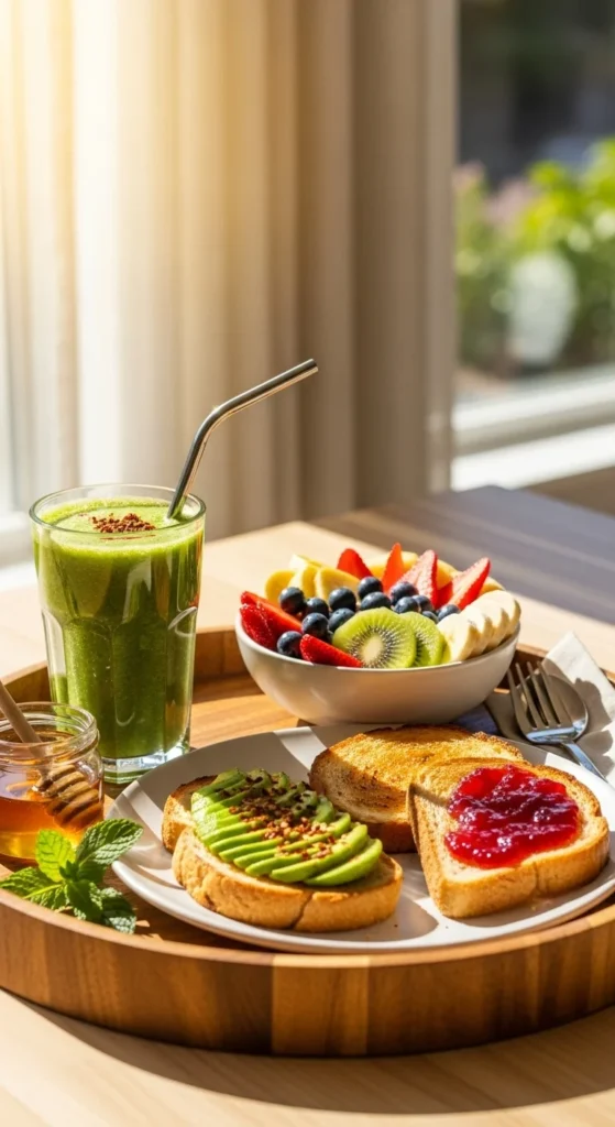 Avocado Toast: Smash avocado on whole-grain toast, sprinkle with salt, pepper, and chili flakes, and top with a poached egg if desired.