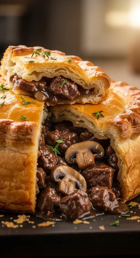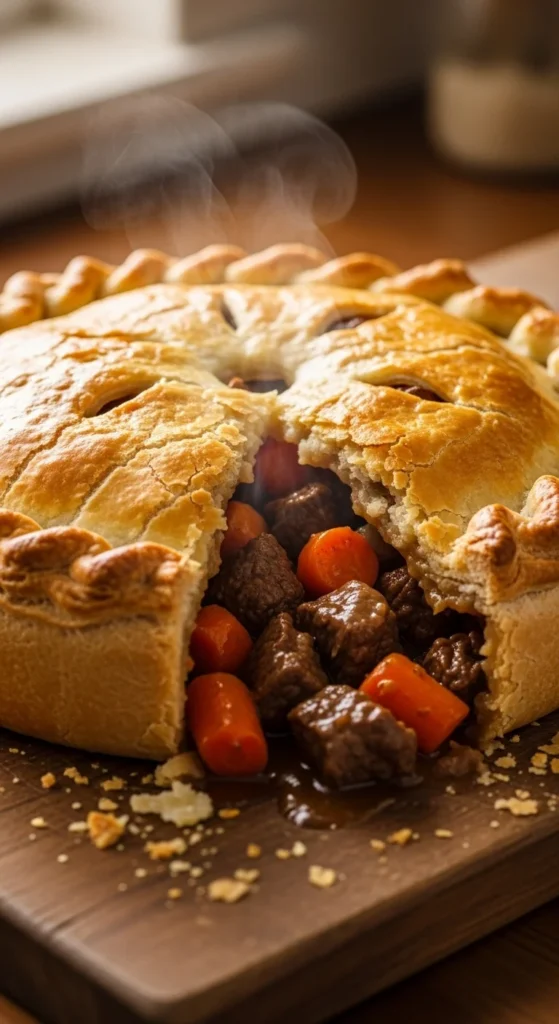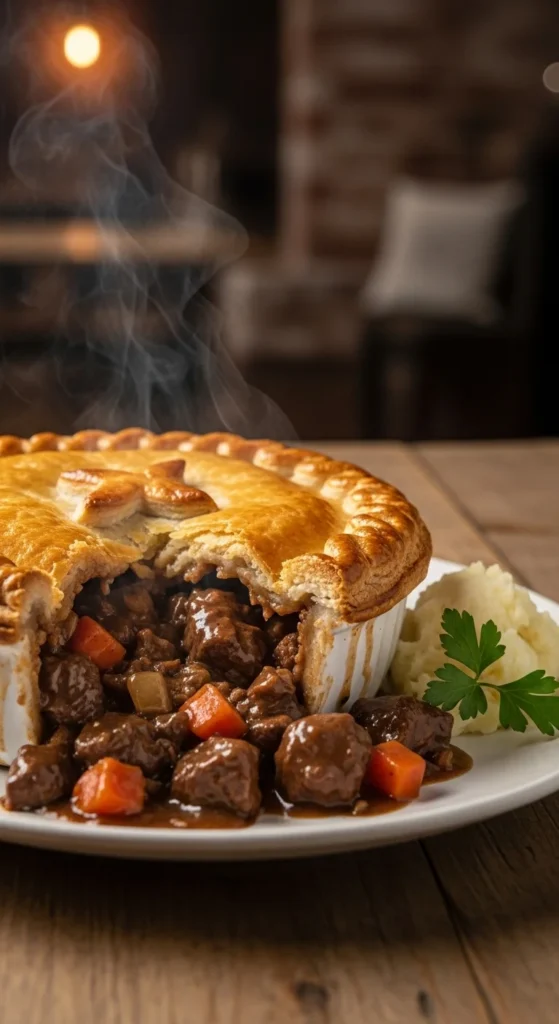 For home cooks, using chuck or stewing beef keeps costs reasonable while still delivering good texture. Store-bought puff pastry saves time without sacrificing quality. Serve with mashed potatoes or peas for a familiar pub-style plate.