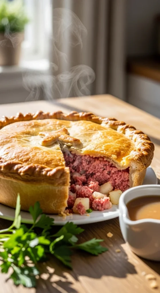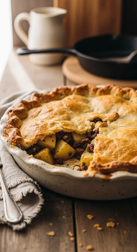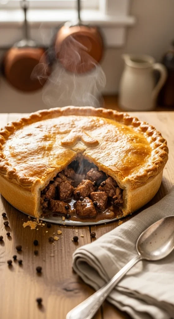 Slow cooking is key for tenderness. This pie suits colder weather and relaxed meals.