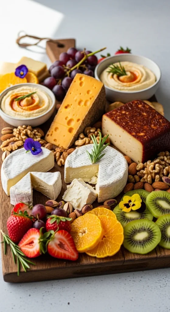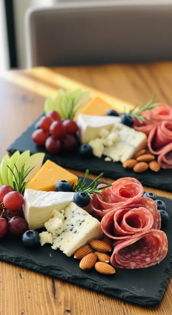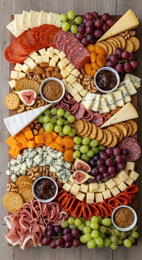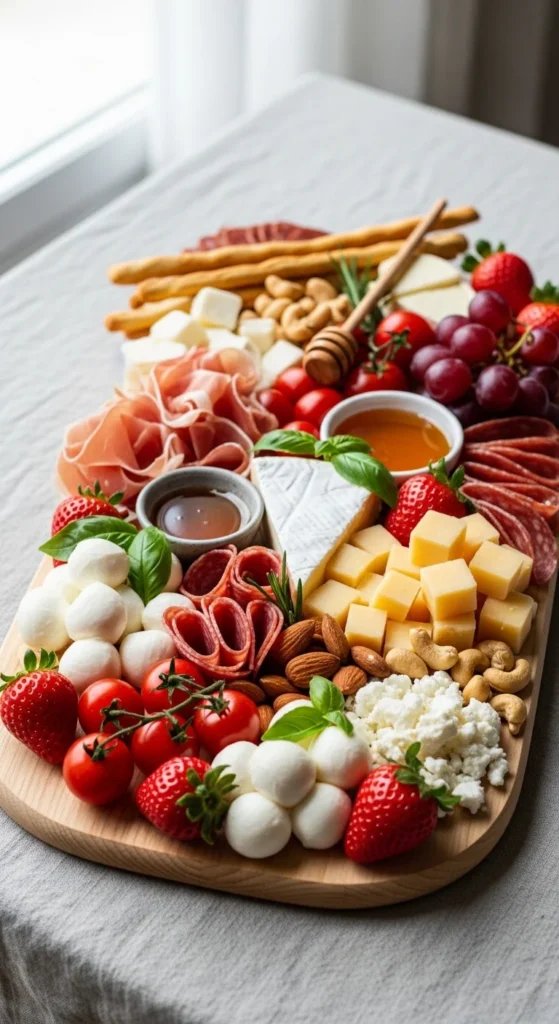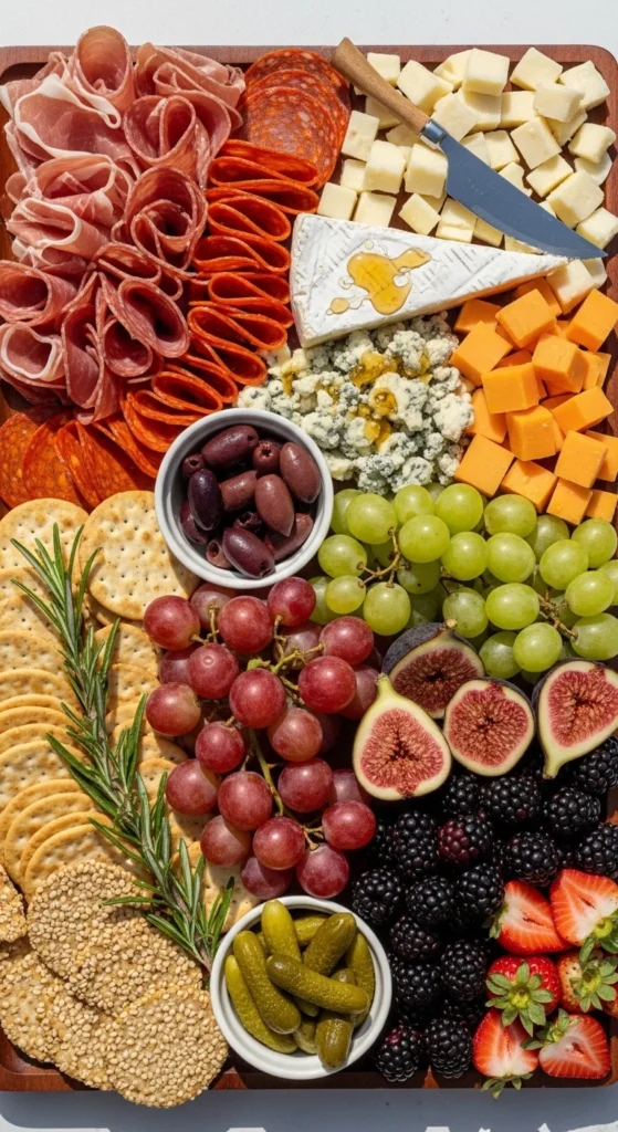 Fruit plays a major role on quick charcuterie boards because it adds color, sweetness, and freshness without any cooking. A rainbow-style fruit layout makes the board feel lively and generous. It also helps soften the look of heavier items like cheese and cured meats.
