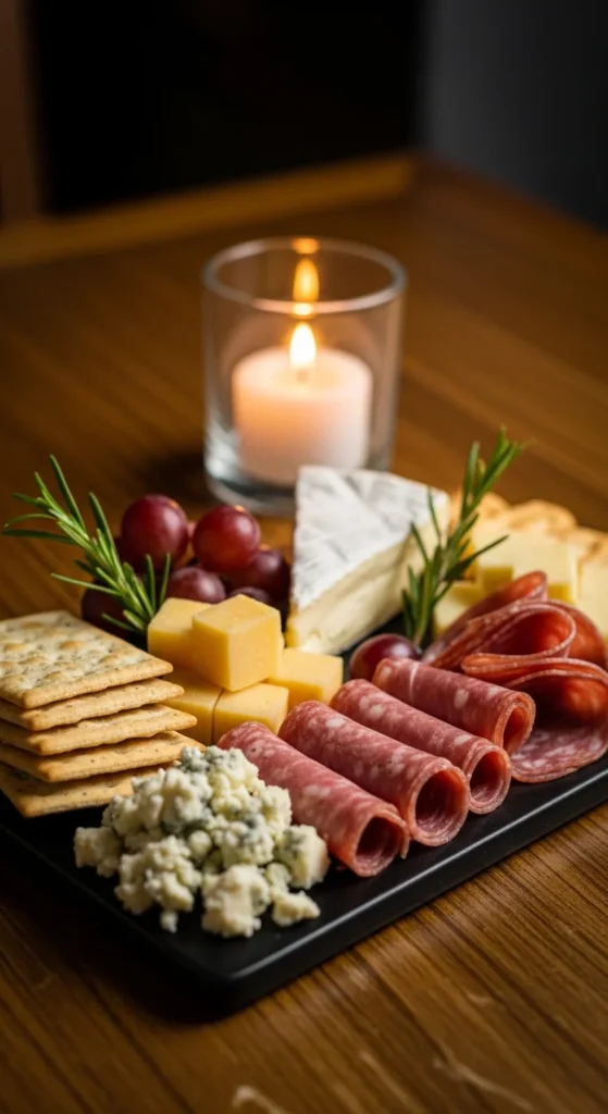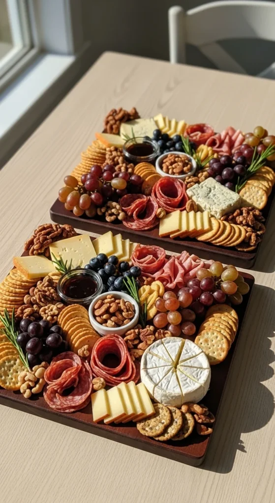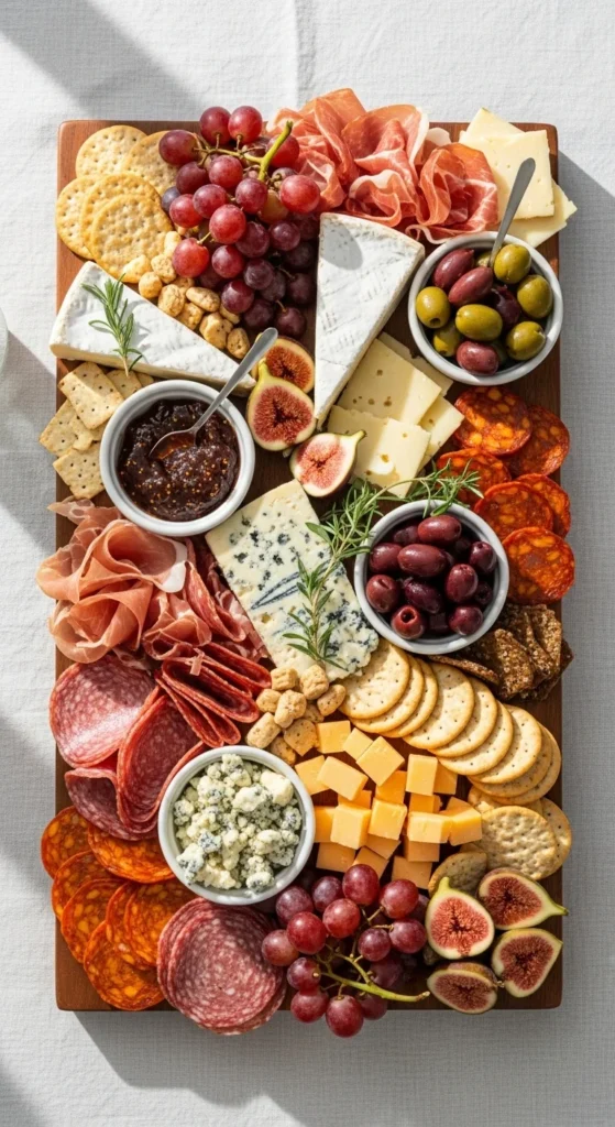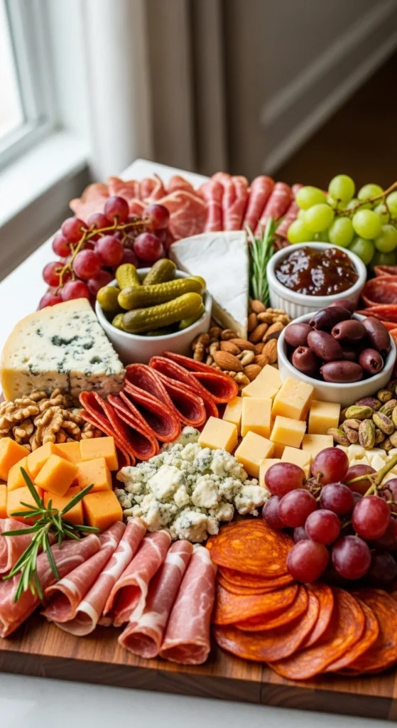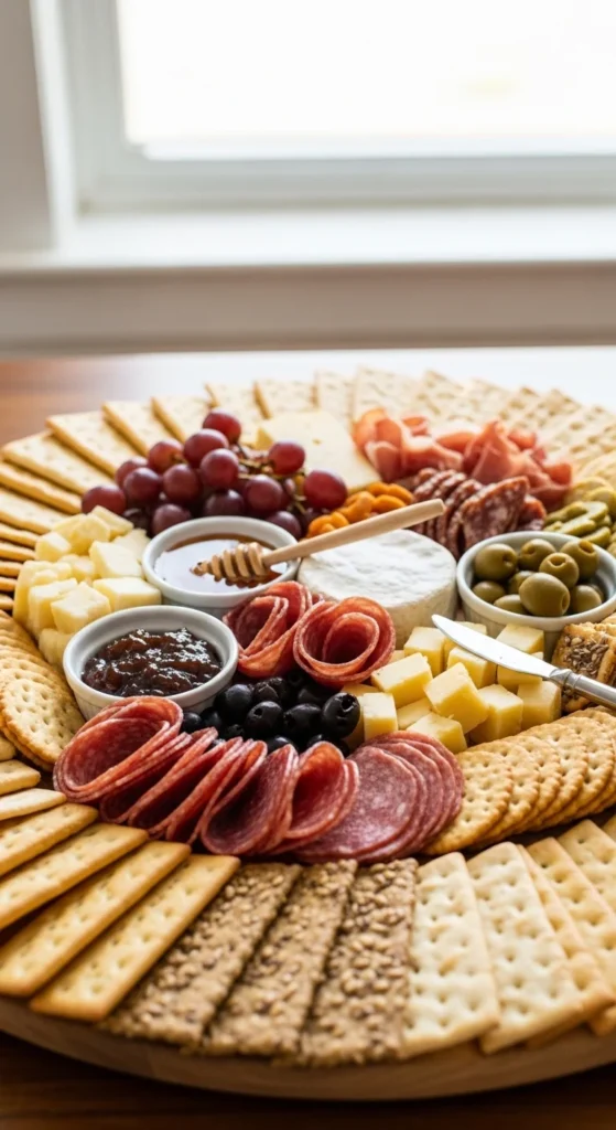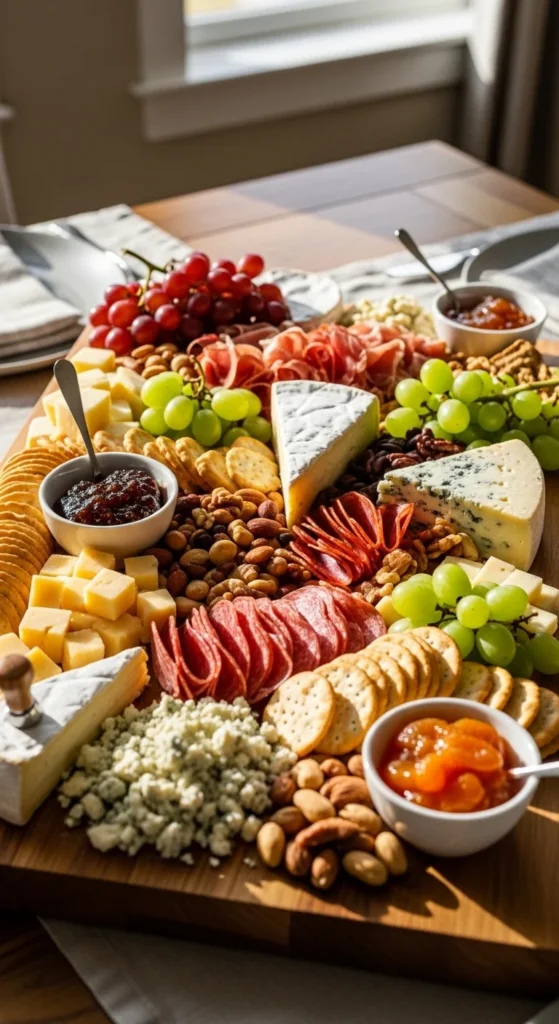 Quick charcuterie boards remove stress from entertaining because they rely on smart structure, not complicated prep. When you start with cheeses, fold meats for texture, and fill gaps with fruit and crackers, the board builds itself. Small details like ramekins, curved layouts, and color balance make even pantry ingredients look thoughtfully arranged.