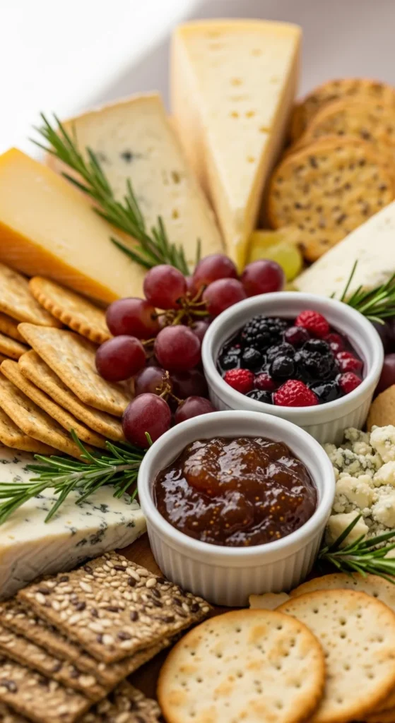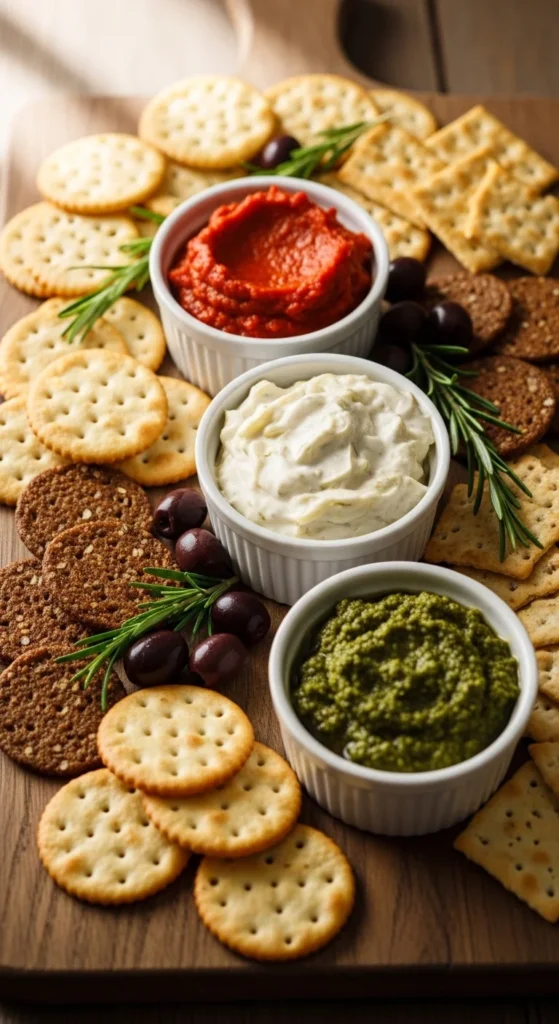 A trio of dips gives guests choices and makes a simple board feel complete. It also adds moisture and flavor contrast next to dry crackers and firm cheeses. Using small bowls keeps crackers from becoming soggy.