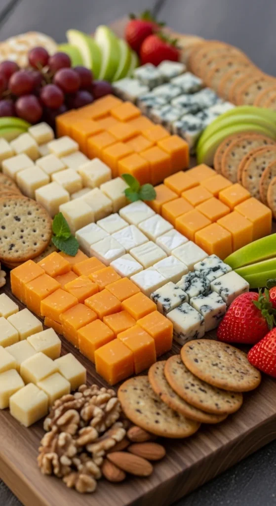Choose two to four fruits in different colors. Grapes, strawberries, blueberries, and orange slices work well. Wash and dry everything. Place small clusters between cheeses and meats rather than spreading fruit thinly across the board.