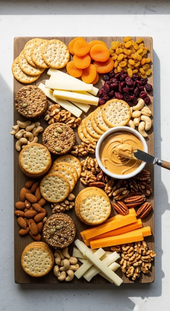 Combine crackers, nuts, dried fruit, and cheese sticks. Add peanut butter in a ramekin.