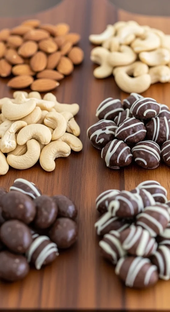 Nuts add crunch and help balance creamy cheeses. A mix of plain and sweet nuts gives contrast. They also fill gaps quickly.
