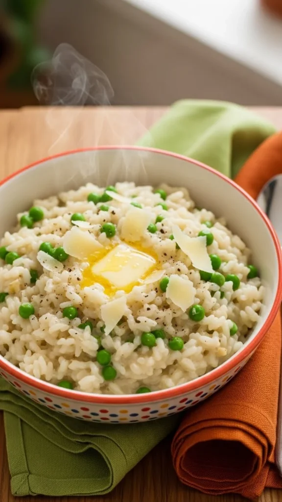 - Stir in butter, peas, and Parmesan.