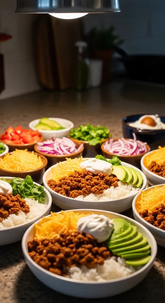 Taco bowls are fast because most parts cook quickly and the rest is assembly. Seasoned meat or beans make the base filling, and rice helps stretch the meal. It’s easy to serve and easy to customize.