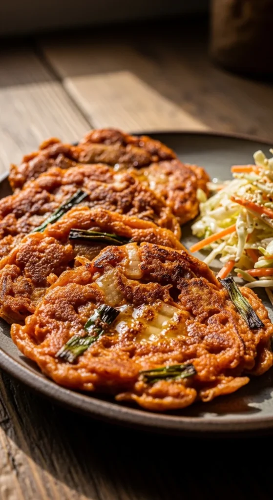 Kimchi pancakes cook fast and deliver strong flavor with minimal ingredients. The outside gets crisp while the inside stays tender. Served with a simple slaw, it feels like a complete dinner, not just a snack.