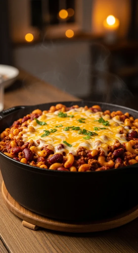 Chili mac is a fast comfort dinner because the pasta cooks in the same pot as the chili base. The sauce thickens as the noodles soften, and everything turns into one cohesive dish. It’s filling and easy to serve in bowls.