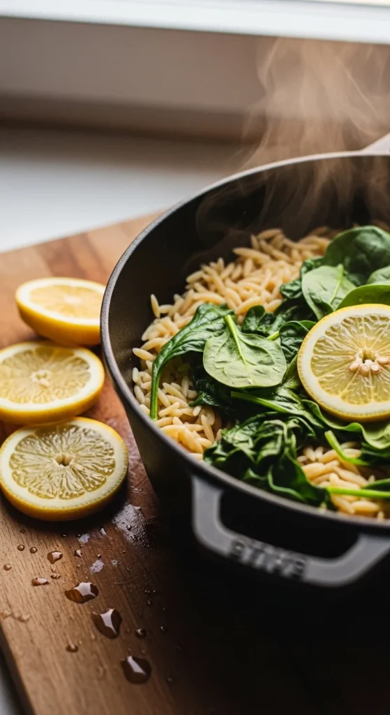 Orzo cooks fast and feels hearty without taking long. When you simmer it in broth, it absorbs flavor quickly and turns silky. Spinach wilts down in seconds, adding color and making the dish feel balanced.