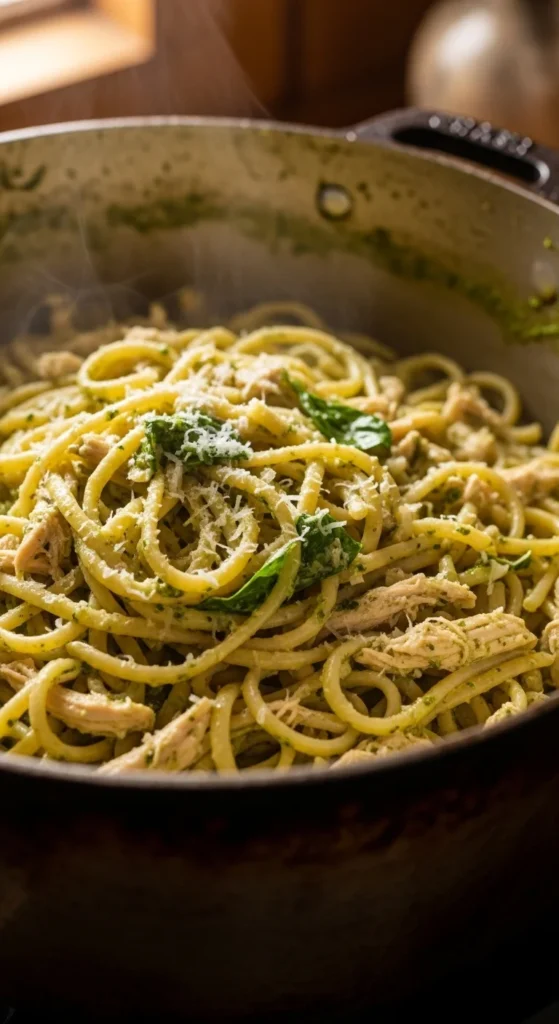 Use jarred pesto to save time, then add a small splash of milk to mellow the sauce. Toss in spinach right before serving so it wilts gently. This also works well with leftover cooked chicken if you’re trying to use what’s already there.