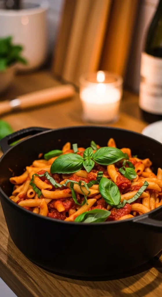 Tomato-based one-pot pasta is a reliable dinner because the sauce and noodles cook together. The pasta releases starch as it simmers, which helps the sauce cling to every bite. Basil added near the end keeps the aroma fresh and the flavor clean.