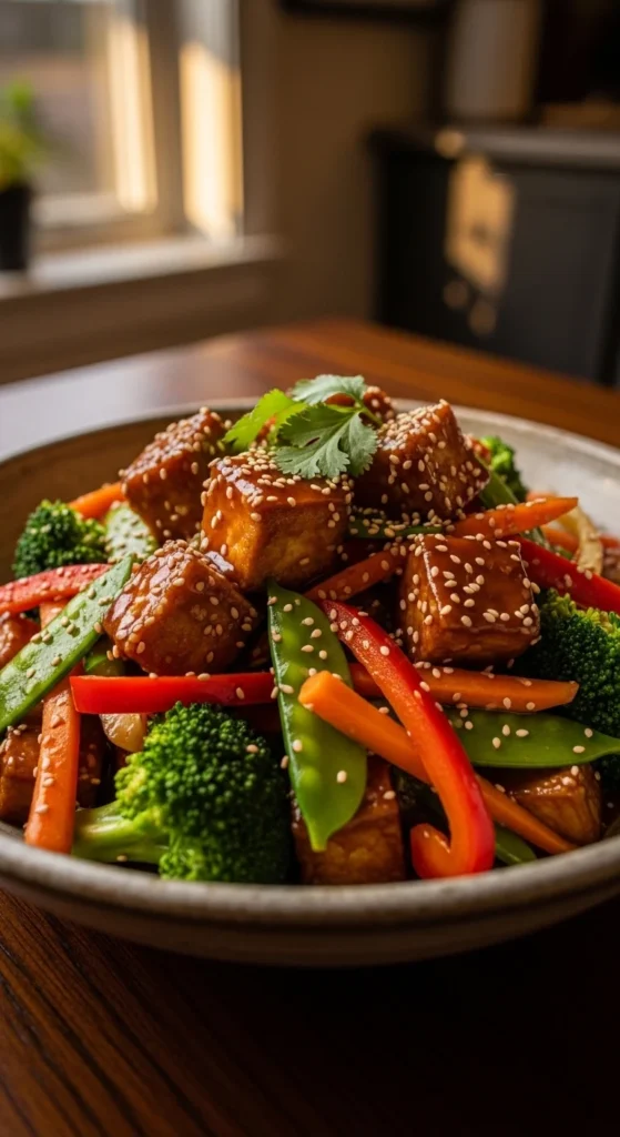 Tofu cooks quickly when pressed lightly and cut into cubes. A hot pan gives it browned edges, and teriyaki-style sauce adds a sweet-savory finish. It’s a meatless dinner that still feels hearty.