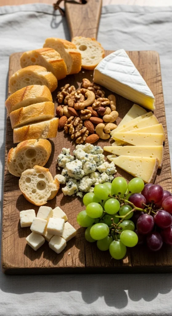 Slice baguette and arrange with cheese, nuts, and fruit. Add crackers if available.