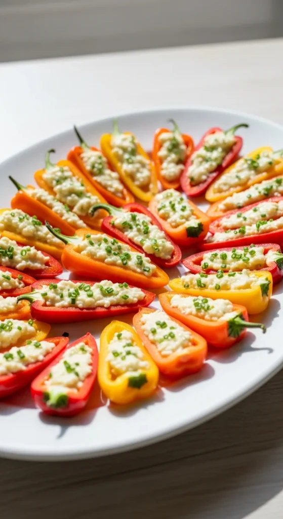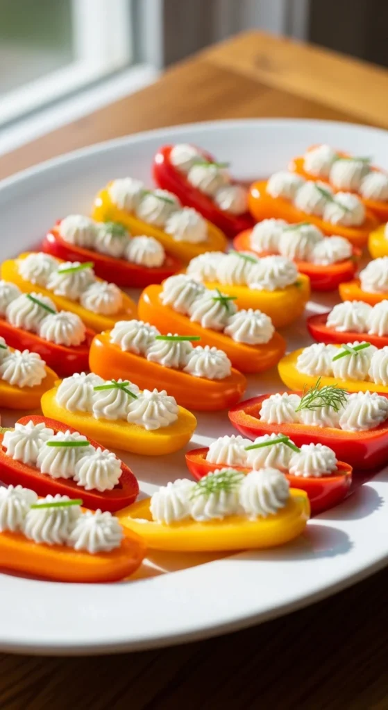 Mini sweet peppers work well as fast party bites because they bring natural sweetness and crunch. When filled with creamy cheese, they become satisfying without feeling heavy. These bites look colorful and fit into no-cook hosting plans.