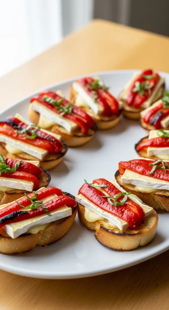 Crostini provide a crisp base for many toppings. Brie melts slightly and adds creamy richness. Roasted red peppers bring mild sweetness and color. This combination feels balanced and appealing.
