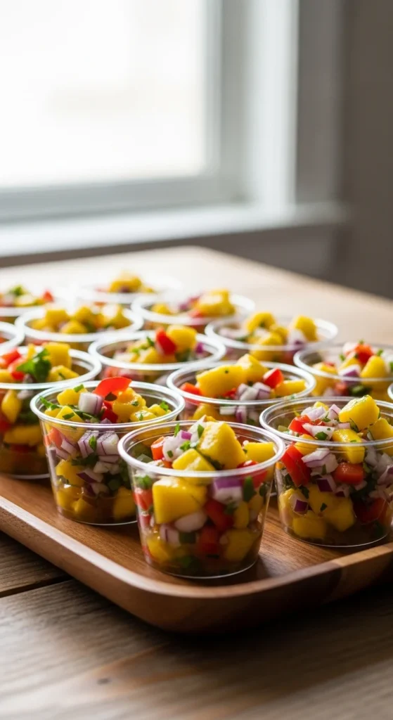 Mango salsa adds bright color and sweet-tangy flavor. Serving in small cups keeps things neat and portable. This option feels fresh and light.
