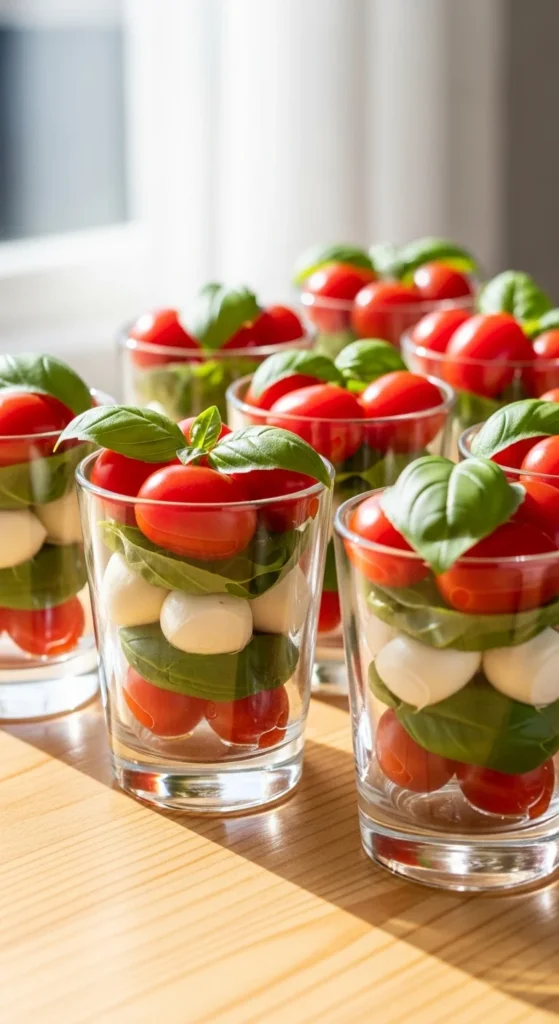 Mini caprese cups offer the same flavor as skewers but with a fresh presentation. They require no cooking and assemble quickly. They also look attractive on the table.