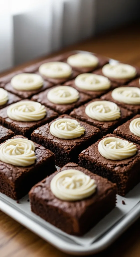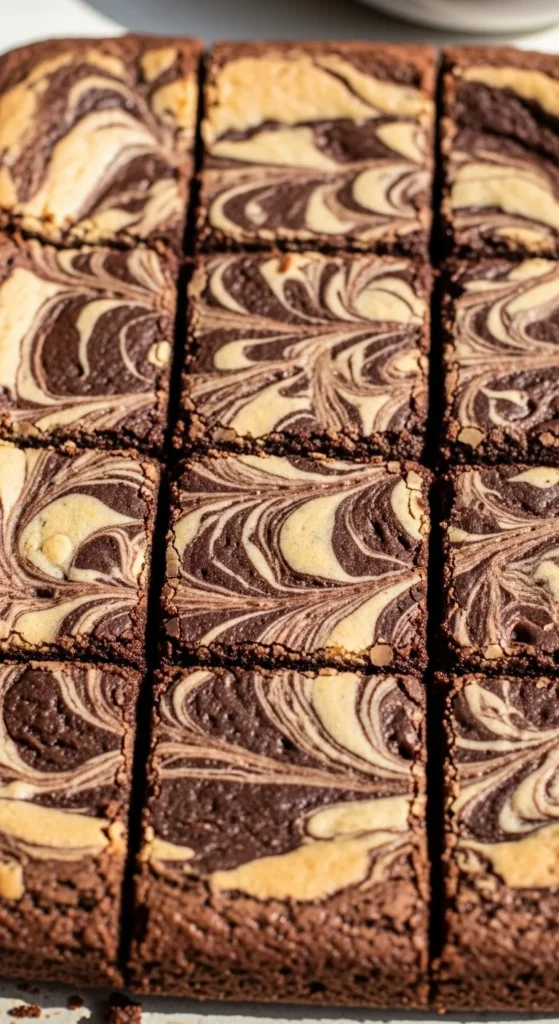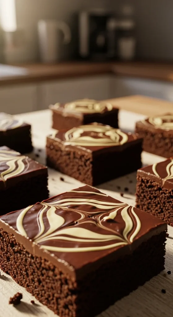 A light hand with the swirl prevents sinking. These brownies look appealing without extra decoration. They suit casual desserts and celebrations.