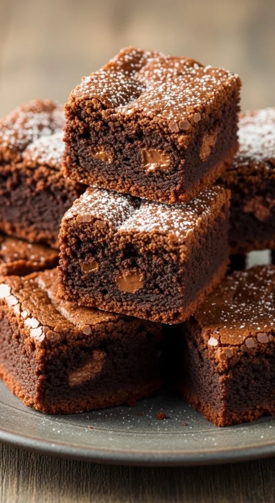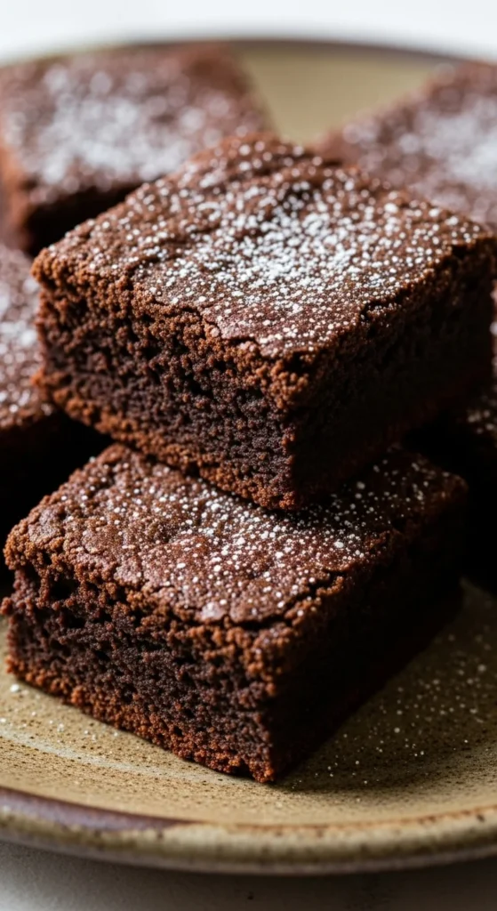 A light sprinkle works best. These brownies suit evening desserts. Serve slightly warm or cooled.