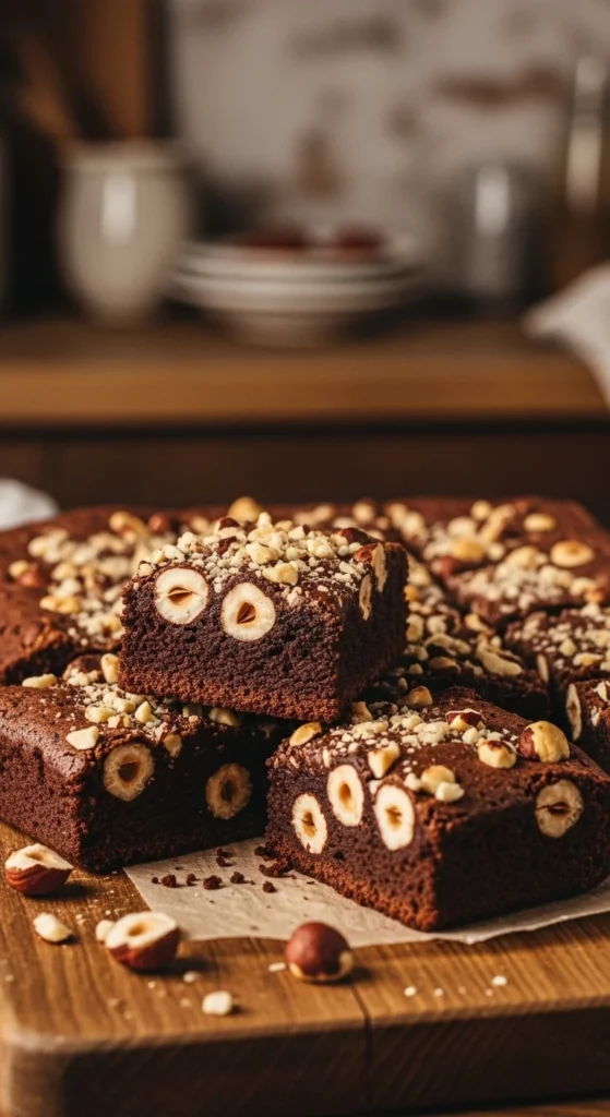 Toast hazelnuts lightly for better flavor. These brownies suit dessert platters. Easy to portion.