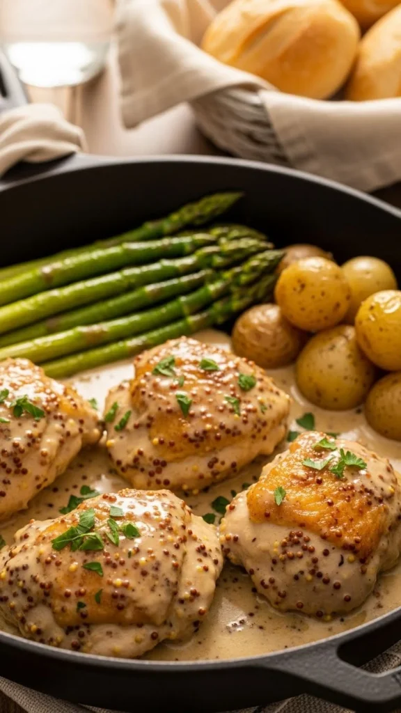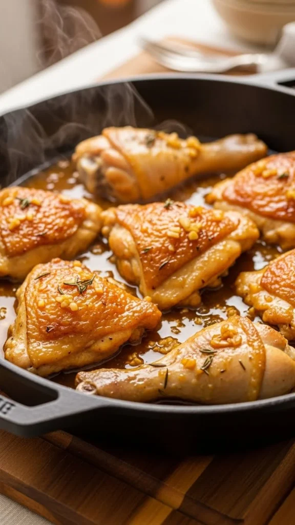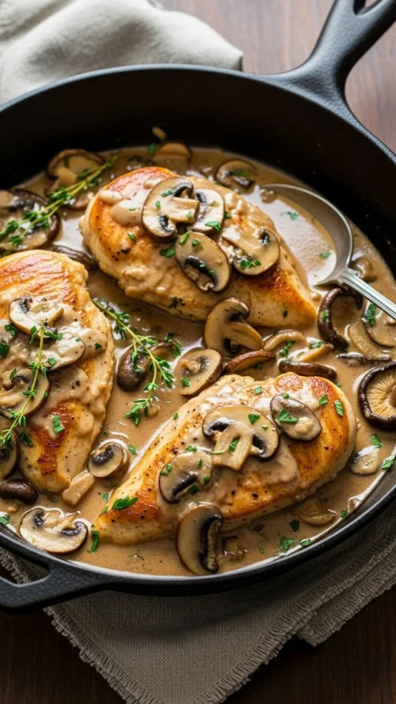 - Return chicken, sprinkle thyme, cover, and simmer 10 minutes.