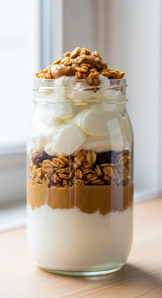 Layer Greek yogurt with a thin spread of almond butter. Add granola for crunch and repeat layers carefully so textures stay balanced.