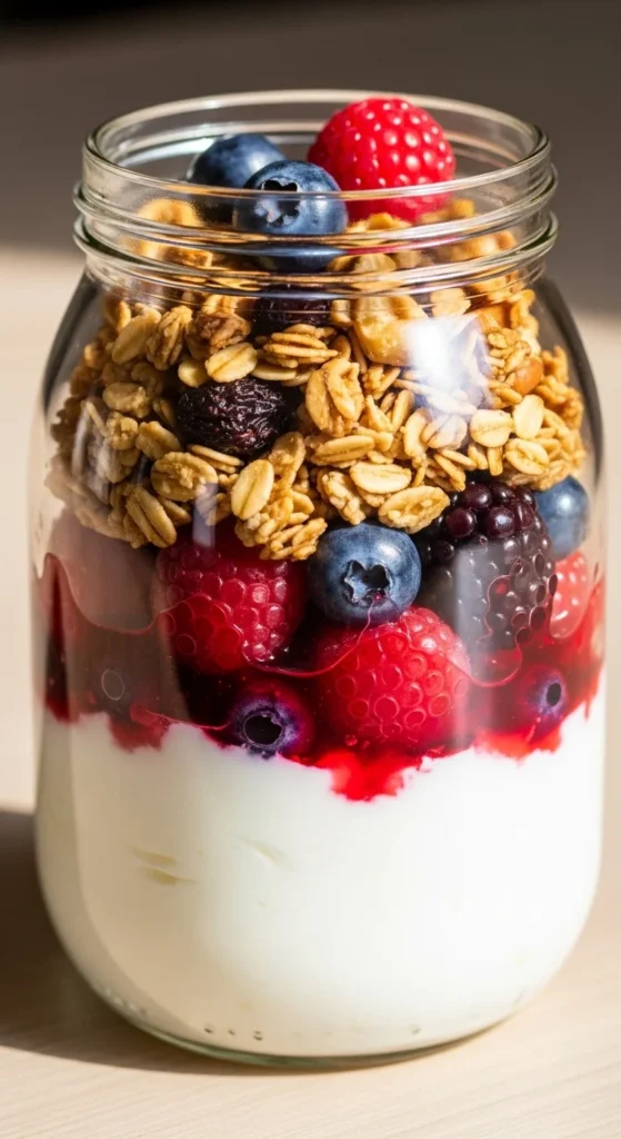 Using three berries adds color and flavor variety. This parfait feels vibrant and fresh.