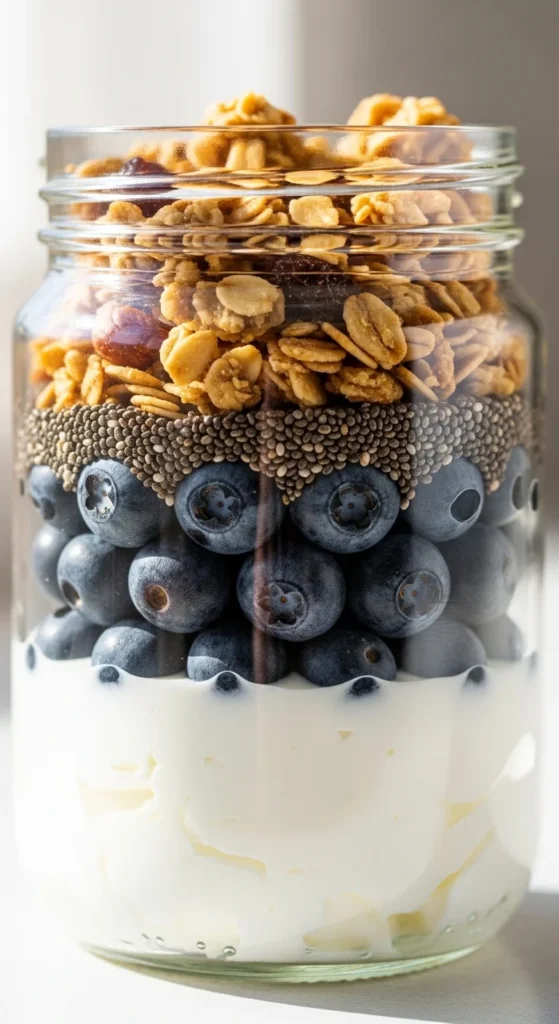 Chia seeds add fiber and a slight pudding-like texture. Combined with blueberries and yogurt, this parfait supports fullness and gentle sweetness.