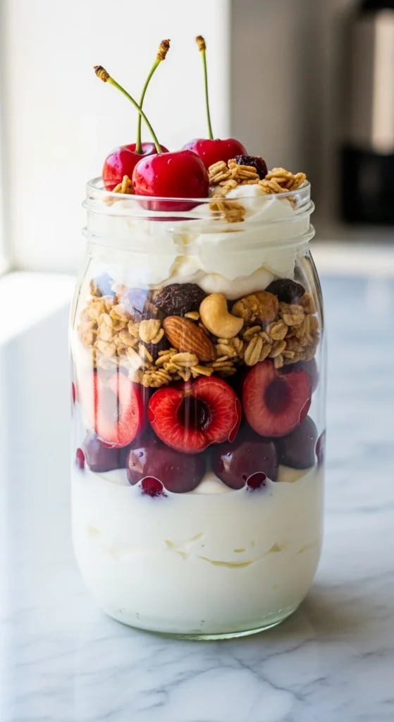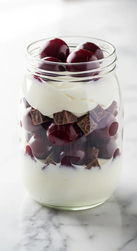 Dark chocolate and cherries create a dessert-style pairing that still fits into balanced eating. The chocolate adds richness, while cherries bring natural sweetness and color. This parfait feels indulgent without heavy ingredients.