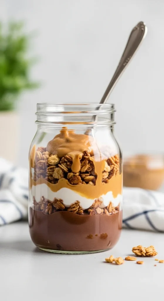 Stir a small amount of cocoa powder into plain Greek yogurt. Layer yogurt with granola and drizzle peanut butter between layers. Repeat until the jar is full.