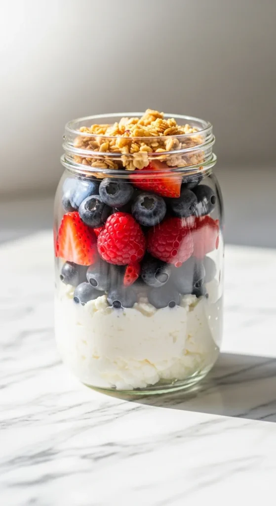 Blend cottage cheese with a splash of milk until smooth. Layer with berries and granola.