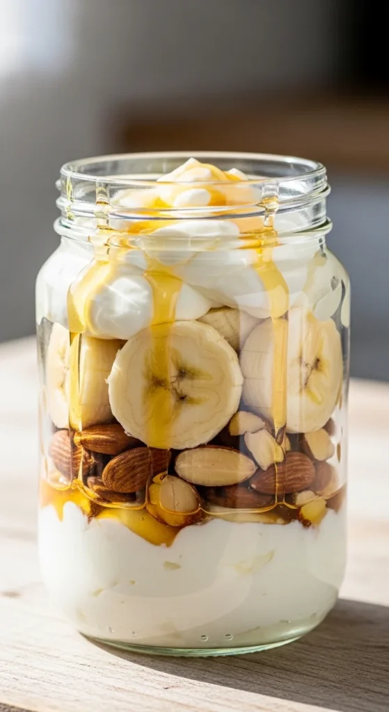 Layer Greek yogurt, banana slices, and chopped toasted almonds. Drizzle honey lightly between layers.