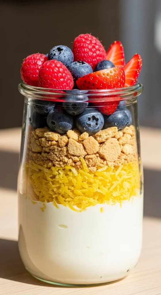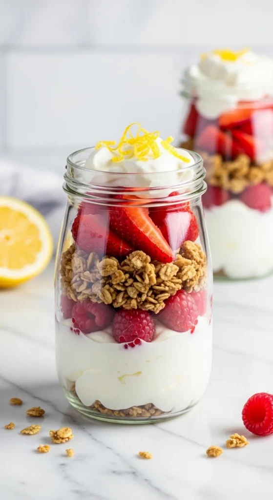 This parfait mimics cheesecake flavor without baking. Lemon adds brightness, while creamy yogurt creates dessert-like texture. It feels indulgent yet balanced.
