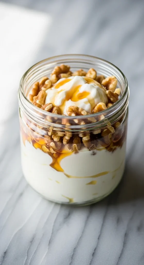 Layer Greek yogurt with chopped walnuts. Drizzle maple syrup lightly between layers.