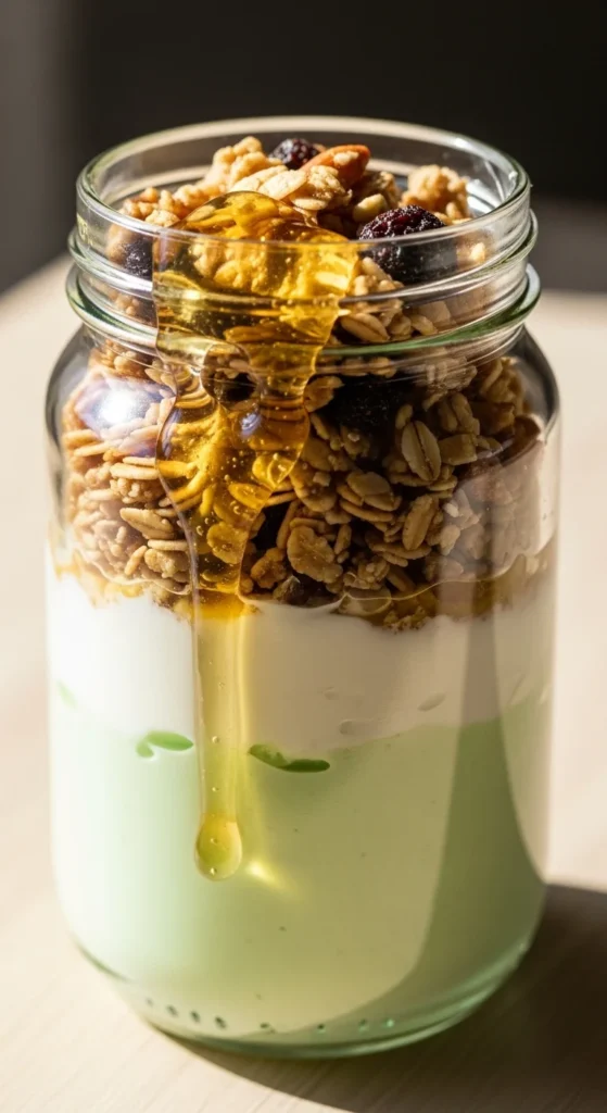 Whisk matcha powder into Greek yogurt. Layer with granola and honey.