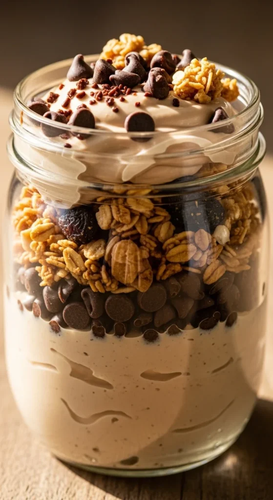 Coffee-flavored yogurt adds subtle mocha notes. This parfait works well for morning routines.