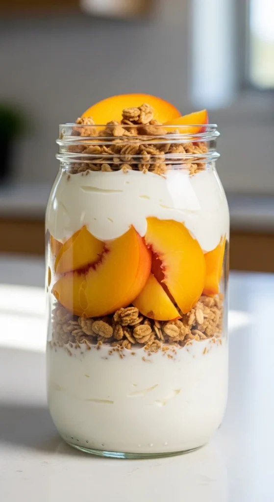 Layer vanilla Greek yogurt with sliced peaches and granola. Repeat layers for visual contrast.