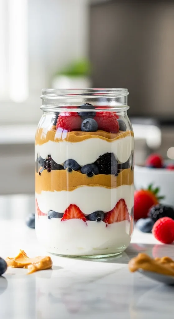 Layer plain Greek yogurt with fresh or frozen berries. Add small spoonfuls of peanut butter between layers so it distributes evenly. Repeat until the jar is full and colorful.