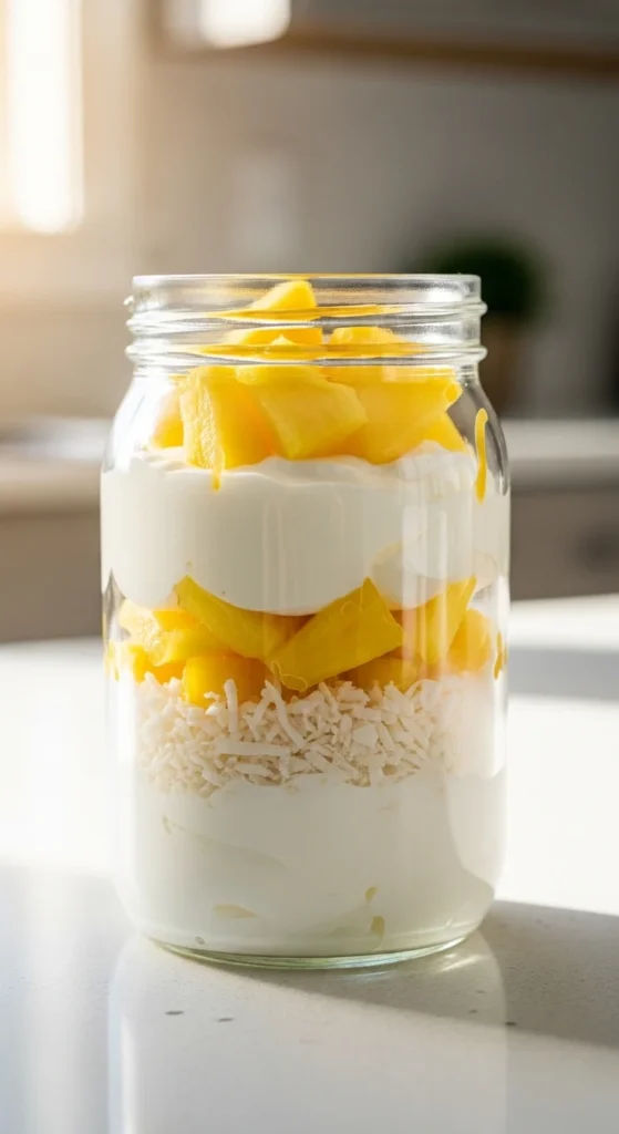 Layer plain or vanilla Greek yogurt with pineapple chunks. Add unsweetened shredded coconut between layers. Repeat until the jar is full.